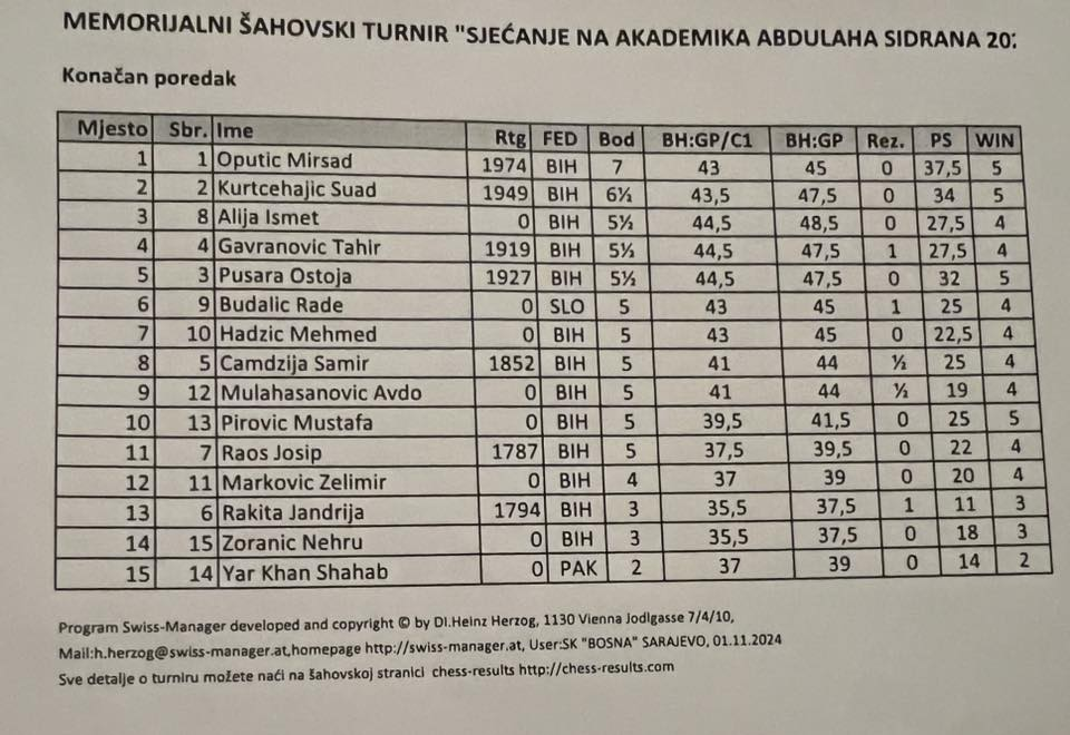 Jučer, u nedjelju 23. marta u prostorijama Šahovskog kluba Sarajevo održan je Memorijalni međunarodni šahovski turnir kulturnih i javnih radnika “Akademik Abdulah Sidran”. Organizatori su obezbijedili prigodne poklone za najuspješnije. Igralo se devet kola a tempo igre je bio 15 minuta po igraču plus tri sekunde po potezu. Turnir je završen kasno navečer oko 21 sat i 30 minuta. Nastupilo je 15 igrača a pobjednik je bio Mirsad Oputić sa sedam poena (pet pobjeda i četiri remija). Drugo mjesto osvojio je akademik Suad Kurtćehajić sa šest i po poena